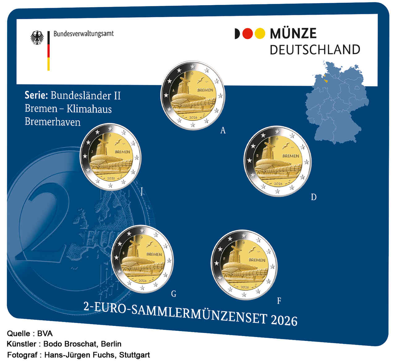 Auflage: 15.000 | enthält die 2 Euro Gedenkmünzen *Bremen - Klimahaus Bremerhaven 2026* mit allen 5 Prägebuchstaben A-D-F-G-J komplett Stempelglanz